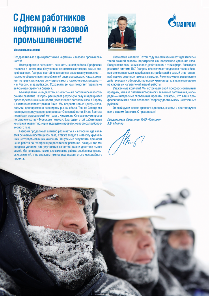 Поздравление председателя правления ПАО "Газпром" А. Б. Миллера с Днем работника нефтяной и газовой промышленности