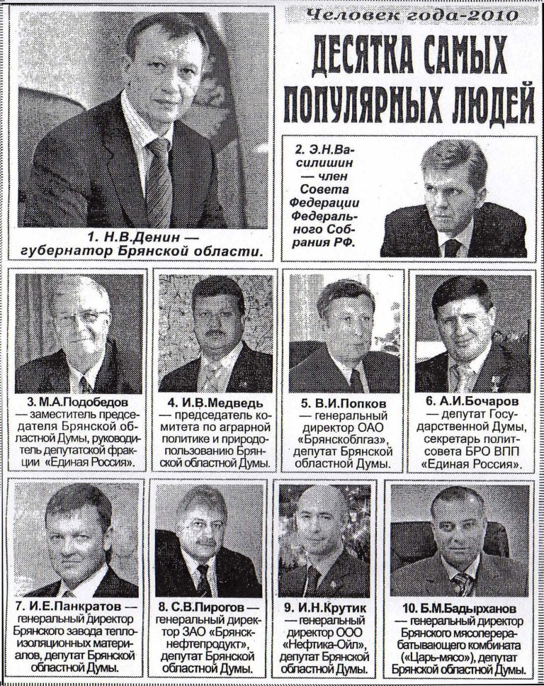 В десятку самых популярных людей Брянщины вошли также Губернатор Брянской области, члены Совета Федерации, депутаты Государственной Думы Федерального Собрания РФ, депутаты Областной Думы, руководители промышленных предприятий региона.